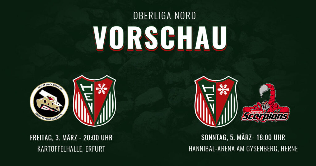 Das letzte Wochenende der Oberliga Nord-Hauptrunde steht an! Der Herner EV ist am Freitagabend zu Gast bei den TecArt Black Dragons in Erfurt (20 Uhr). Zum Abschluss kommt dann, mit den Hannover Scorpions, der Hauptrunden-Meister am Sonntag in die Hannibal-Arena (18 Uhr). Die Ausgangslage ist dabei relativ einfach. Herne liegt aktuell auf Rang sieben, hat […]