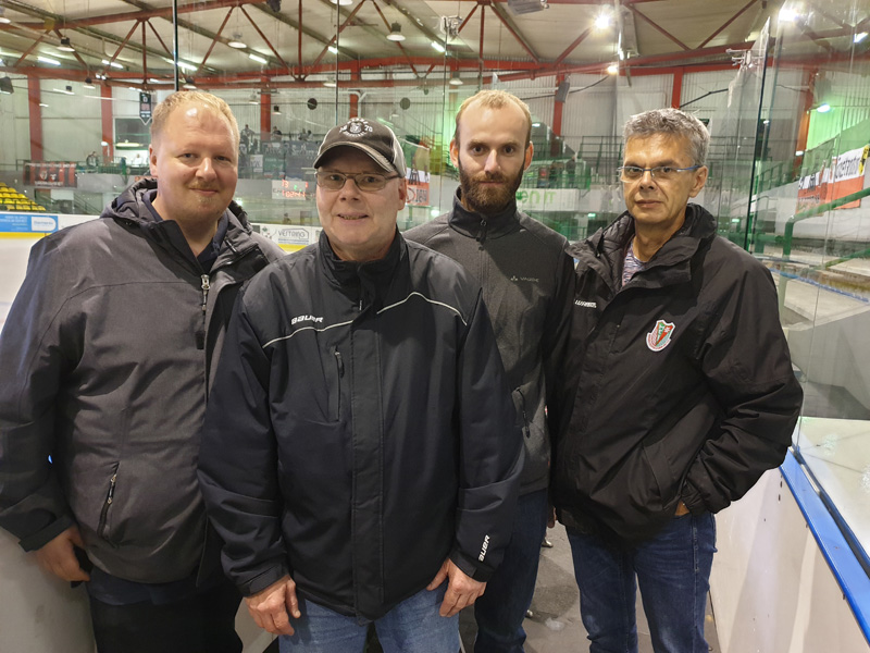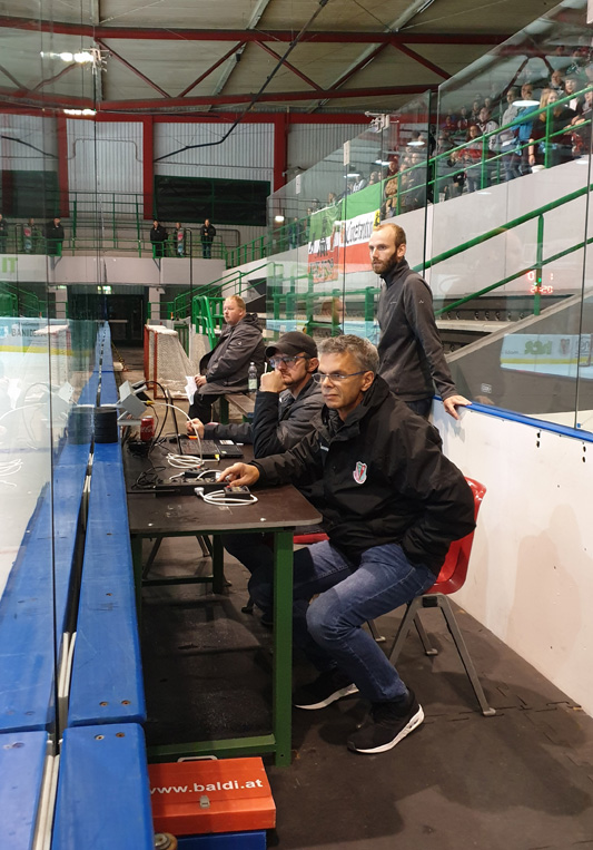 Wir beginnen mit dem Team welches sich um die Zeitnahme sowie die Strafbänke kümmert und am Rande der Eisfläche gut sichtbar arbeitet.