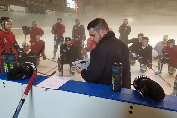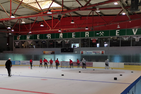 Die Liste der Vorbereitungen des Herner EV auf die neue Spielzeit ist lang und vieles konnte bereits erfolgreich bewältigt werden. Der Einbau der neuen Bande in der Hannibal-Arena ist abgeschlossen und in den letzten Tagen haben die Eismeister kontinuierlich die Eisschicht aufgebaut. Bis auf Patrick Asselin, der erst Anfang September nach Herne kommt, haben alle Spieler bereits nicht nur ihre Wohnungen bezogen, sondern auch ihren Platz in der Kabine eingerichtet. Ein erstes Mannschaftstreffen zum Kennenlernen mit den Verantwortlichen drum herum gab es am Mittwochabend bei herrlichem Sonnenschein, am Donnerstagmorgen folgten dann die medizinischen Checks beim neuen Kooperationspartner, dem St. Anna Hospital Herne. Anschließend ging es zum ersten Mal gemeinsam aufs Eis. Damit hat die gut sechswöchige intensive Vorbereitungszeit für das Team von Cheftrainer Danny Albrecht und Co-Trainer Lars Gerike begonnen. Insgesamt warten elf Vorbereitungsspiele auf die Grün-Weiß-Roten, davon sieben auf heimischem Eis am Gysenberg. Den ersten Kontakt mit den Fans des HEV gibt es am Samstag ab 11 Uhr in der Hannibal-Arena beim öffentlichen Training mit Skill Competition und Trainingsspiel.