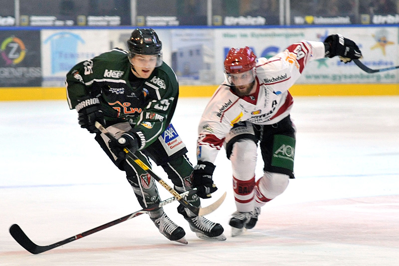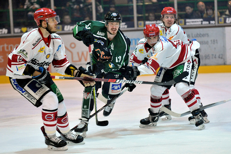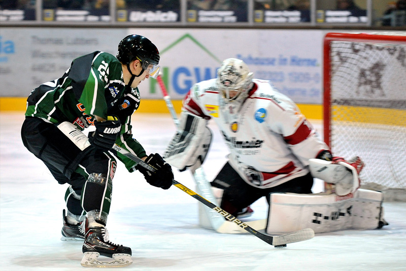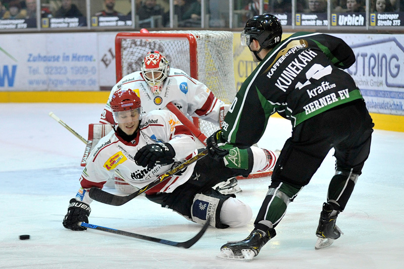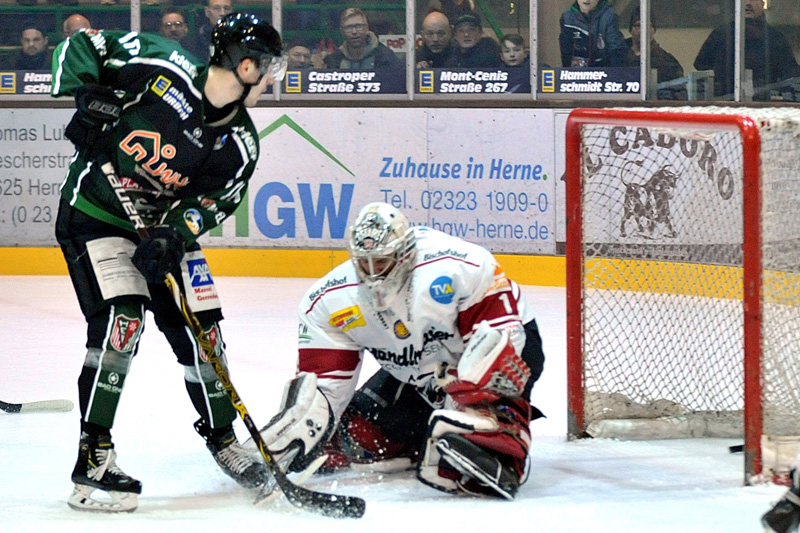 Die Partie nahm von Beginn an Fahrt auf und so gab es bereits nach 38 Sekunden die ersten Strafzeiten gegen beide Mannschaften. Die erste Chance hatten die Eisbären, die aggressiver und körperbetonter agierten als vor zwei Tagen in der 2. Spielminute, kurz darauf hatte Tom Schmitz die erste Herner Chance. Und so ging es weiter, beide Teams schenkten sich in einem tollen Playoff-Fight nichts. Wie schon im Hinspiel bewies der Herner EV die bessere Chancenverwertung, denn in der 6. Minute fiel bereits das 1:0 durch Marcus Marsall nach perfektem Zuspiel von Nils Liesegang. Die Regensburger Möglichkeiten vereitelte weiterhin Björn Linda im HEV-Tor, so z.B. in der 10. Minute. Kurz darauf hatte Patrick Asselin gleich zwei Chancen in kurzer Folge, seine Zeit als Torschütze sollte erst im zweiten Abschnitt kommen. Zuerst war es Philipp Kuhnekath, der in der 16. Minute ein tolles Zuspiel von Brad Snetsinger, der sich den Puck an der gegnerischen blauen Linie erkämpft hatte, zum 2:0 verwandeln konnte. In der 18. Minute gab es dann eine unglückliche Situation, als Maik Klingsporn den Regensburger Korbinian Schütz in die Bande checkte. Der Verteidiger war vor der Berührung von Maik Klingsporn schon ins Straucheln geraten, so dass er tief in die Bande rutschte. Die ausgesprochene Spieldauer-Disziplinarstrafe gegen den HEV-Verteidiger war dennoch vertretbar, er wird den Grün-Weiß-Roten am Dienstag wegen der automatischen Sperre fehlen. In der nun folgenden fünfminütigen Unterzahl geriet der HEV unter Druck, denn die Gäste versuchten nun alles um zum ersten Tor zu kommen. Aber die HEV-Defensive und Björn Linda blieben standfest und auch ein etwas kleinlicher Penalty (Patrick Asselin hatte von hinten leicht mit dem Stock gearbeitet) von Nikola Gajovsky konnte Björn Linda in gewohnter Manier vereitel. Die Pause kam dennoch zur rechten Zeit.