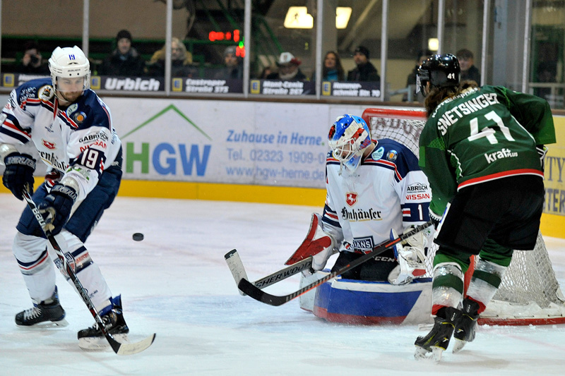 Der Herner EV musste sich am Freitagabend starken Hannover Indians in der Overtime mit 2:3 beugen. In einer intensiven und umkämpften Partie bot das Team von Danny Albrecht dem Tabellendritten lange Zeit Paroli, musste dann aber in der 64. Minute, 62 Sekunden vor Ende der Extra-Spielzeit, einen unglücklichen Treffer von Indians Stürmer Branislav Pohanka hinnehmen. Dessen Schuss wurde abgefälscht und trudelte als Bogenlampe hinter dem erneut gut haltenden HEV Keeper Björn Linda ins Gehäuse der Grün-Weiß-Roten. Trotzdem konnte man sich aus Herner Sicht eher über einen Punkt freuen, der mit großem kämpferischen Einsatz gegen vor allem im zweiten Drittel und auch kurz vor Ende der regulären 60 Minuten sowie über weite Strecken der Overtime dominierende Gäste aus Niedersachsen.