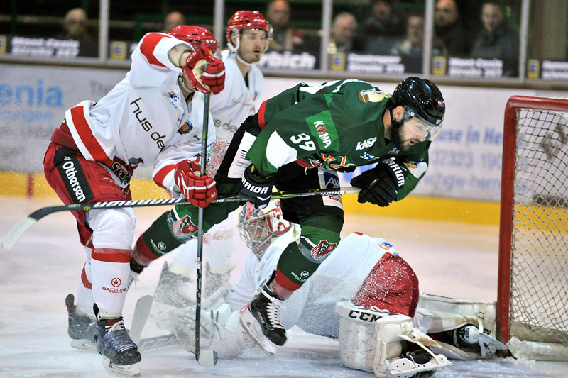 In einer sehr intensiven und kampfbetonten Oberligabegegnung, die bis zum Schlusspfiff ausgesprochen spannend blieb, konnte sich der Herner EV am Sonntagabend zuhause in der Hannibal-Arena mit 3:2 gegen die Hannover Scorpions durchsetzen. HEV-Goalie Lukas Schaffrath, der von beiden Trainern ein Sonderlob bekam, konnte mit seinem letzten Save fünf Sekunden vor Spielende die drei Punkte festhalten. Damit konnten die Grün-Weiß-Roten zumindest vorübergehend das Team aus der Wedemark in der Tabelle überflügeln und stehen nach den fünf Punkten des Wochenendes nun auf Platz drei. Dies ist umso bemerkenswerter, da weiterhin mit Patrick Asselin, Mike Schmitz und Vojtech Suchomer wichtige Spieler fehlten. Deshalb verdienen die beiden jungen Förderlizenzspieler Nicolas Geitner (19 Jahre) und Edwin Schitz (18 Jahre), die am Wochenende in der Abwehr spielten und ihre Sache sehr gut machten, ebenfalls positive Erwähnung.