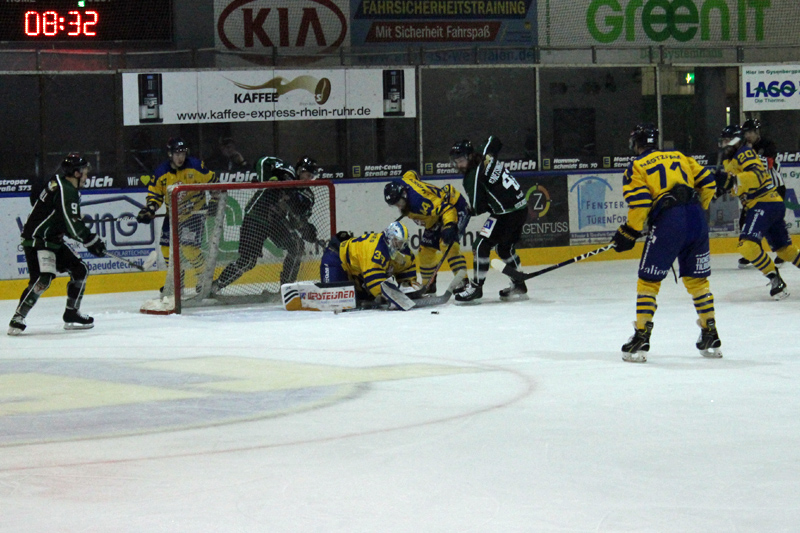 Dann aber folgte doch noch eine tolle Aufholjagd, die die Halle zum Beben brachte. Bei angezeigter Strafe gegen die Trappers zog Dennis Thielsch in der 43. Minute von der rechten Seite ab und hämmerte den Puck ins kurze Eck: 1:4. Ganze 56 Sekunden später machte sein ‚Kumpel‘ Marcus Marsall das gleiche, dieses Mal von der linken Seite: 2:4. Als dann in der 49. Minute Patrick Asselin nach guter Vorarbeit von Brad Snetsinger sogar in Unterzahl auf 3:4 verkürzen konnte, da hielt es niemanden mehr auf den Sitzen. Ein lautstarker Jubel-Orkan war der verdiente Lohn für die erneut tolle Moral der Gysenberger. Die Trappers zeigten sich beeindruckt, ihr Trainer hatte bereits zur Beruhigung seines Teams nach dem 2. HEV-Treffer eine Auszeit genommen. Die Grün-Weiß-Roten hatten noch weitere Chancen und der Ausgleich wäre sicherlich nicht unverdient gewesen. Am Ende zeigten die Tilburger aber dann doch, warum sie in den letzten vier Jahren noch keine Playoff-Serie verloren haben. Das 3:5 in der 59. Minute war dann der Endstand in einer Partie, die allein schon durch diese Aufholjagd begeisterte.