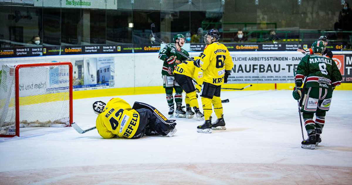 Dennis Swinnen stocherte die Scheibe zum 5:1 über die Linie, Kevin Orendorz machte beim 6:1 seinen Hattrick perfekt. In der Folge hätte Herne das Ergebnis noch deutlich höher schrauben können, scheiterte jedoch immer wieder an Patrick Klein. Für den Schlusspunkt sorgte auf der anderen Seite der ehemalige HEV-Akteur Tom Schmitz mit dem 6:2.