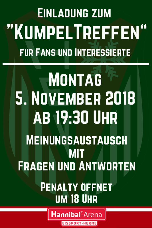 Das erste ‚Kumpeltreffen“ der Saison 2018/19 beim Herner EV findet am kommenden Montag, dem 5. November 2018 ab 19:30 Uhr im Penalty der Hannibal-Arena statt.
