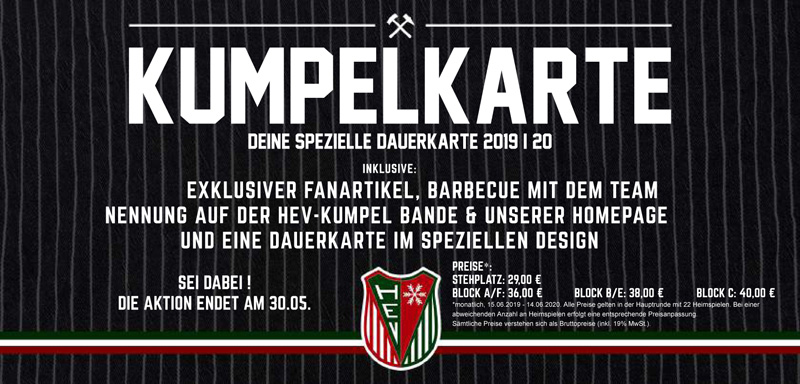 Bei der Saison-Abschlussfeier konnte HEV-Geschäftsführer Jürgen Schubert am Freitagabend verkünden, dass es die ‚Kumpelkarte‘ auch für die kommende Saison 2019/20 geben wird. Diese ‚Kumpel-Aktion‘ geht bis zum Donnerstag, den 30. Mai 2019!