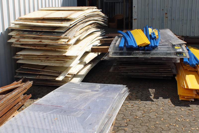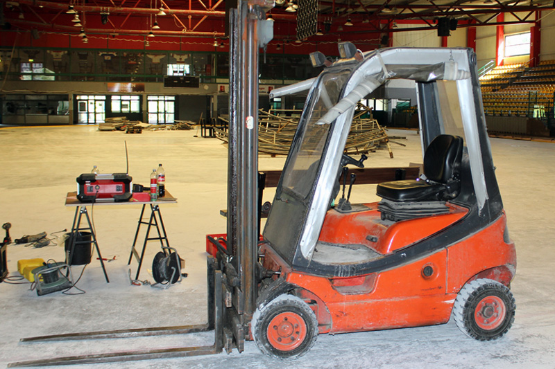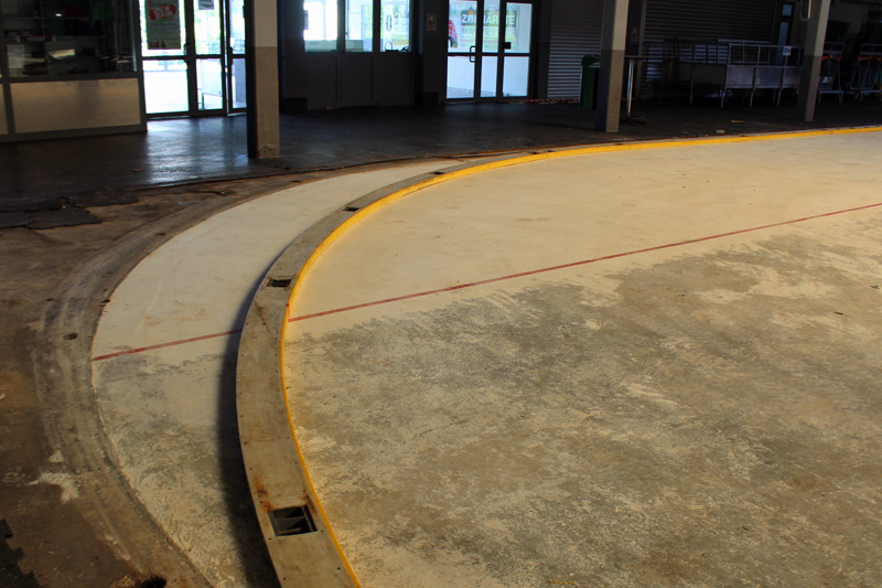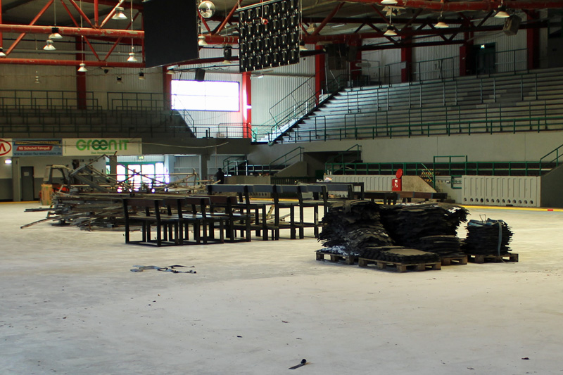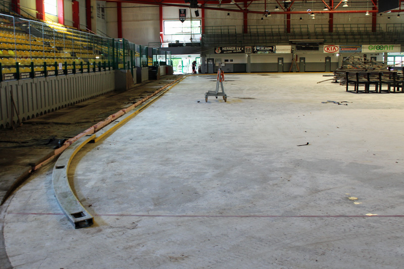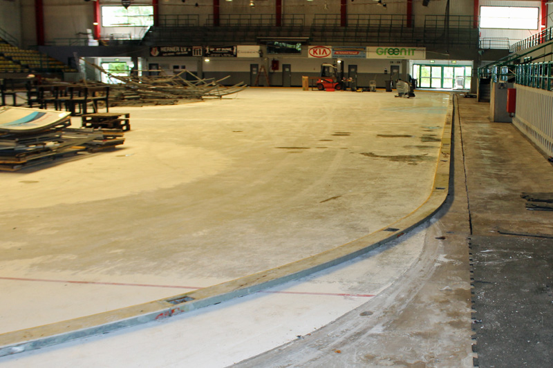 Keine Sommerpause herrscht aktuell in der Hannibal-Arena am Herner Gysenberg. Zur Vorbereitung auf den Einbau einer neuen Bandenkonstruktion wird momentan die bisherige altehrwürdige Bande abgerissen und entsorgt. Dank der fleißigen Helfer konnte die ehemalige Konstruktion bereits komplett abgebaut werden, so dass es im Augenblick beim Herner EV eher nach einer Großbaustelle aussieht als nach Eishockey. Aber das wird sich im Laufe des Sommers wieder ändern. Immerhin kann man aber schon erkennen, dass sich durch die Neukonstruktion der Bandenradius etwas verändern wird, denn die Bodenverankerung der neuen Bande wurde schon einmal provisorisch ausgelegt. Man darf sicherlich gespannt sein, wie sich der Umbau in den nächsten Wochen weiter entwickeln wird.
