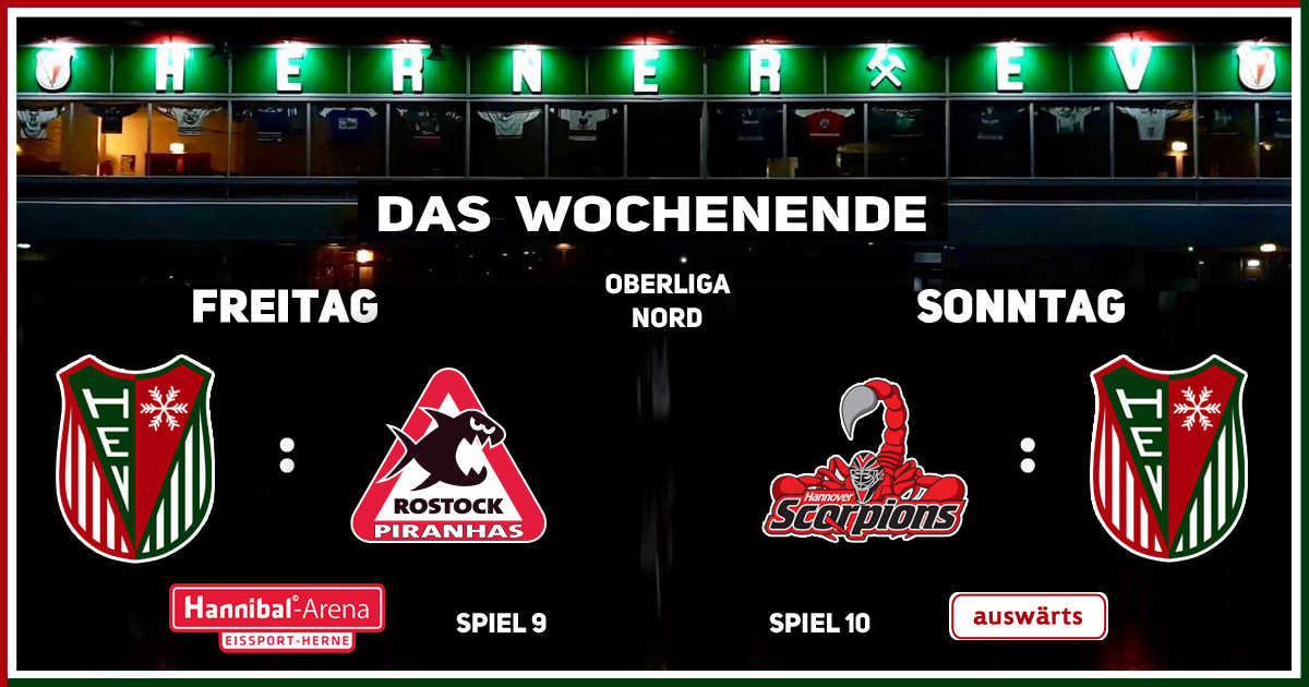 „Die Piranhas spielen sehr defensiv, die Scorpions dagegen sehr offensiv“. So charakterisiert Cheftrainer Danny Albrecht die beiden Gegner des Herner EV am Wochenende. Am Freitag empfangen die Gysenberger ab 20 Uhr die Rostock Piranhas in der heimischen Hannibal-Arena, am Sonntag geht die wöchentliche Auswärtsfahrt in die Wedemark.